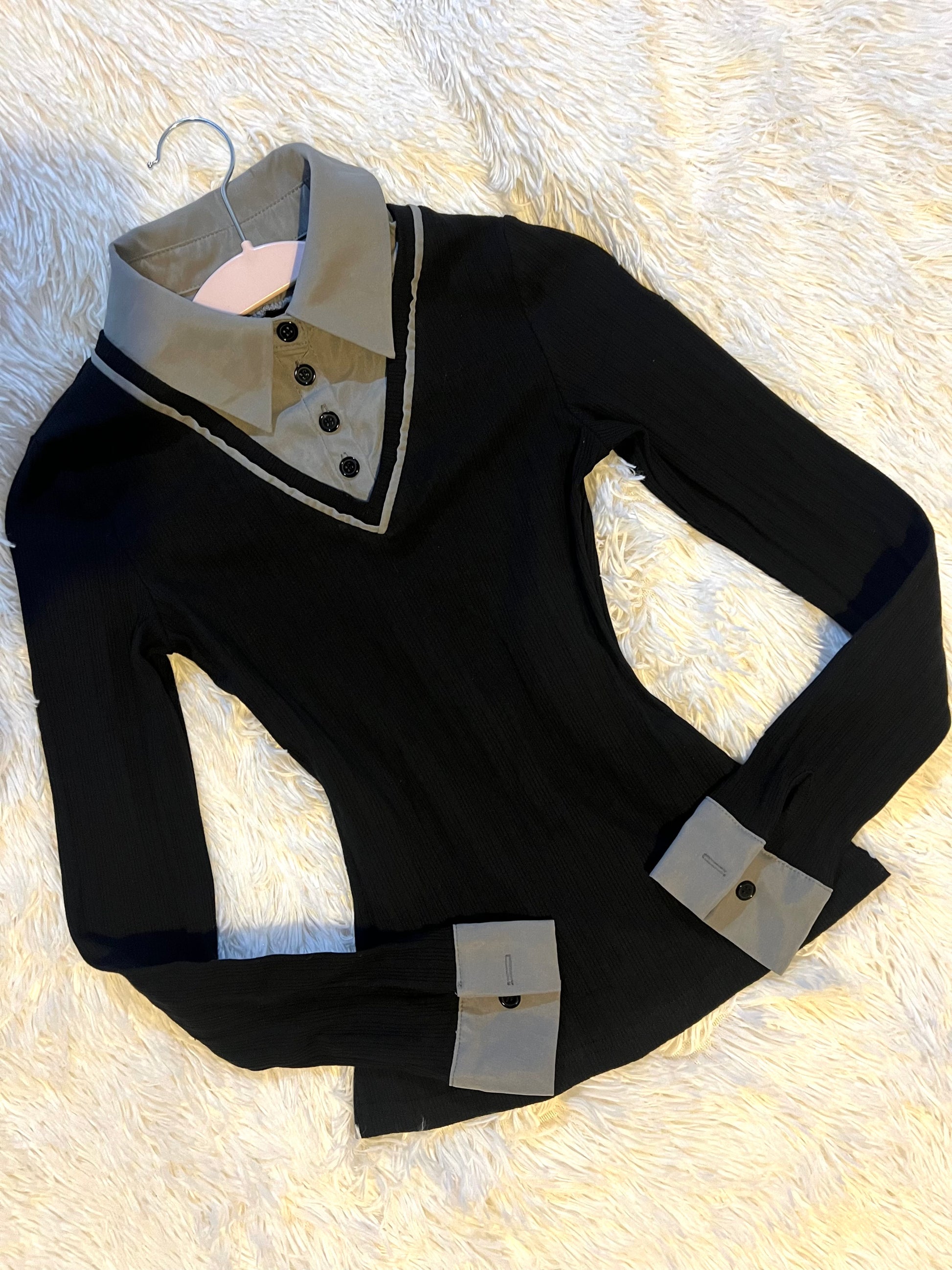 This top strikes the perfect balance between feminine charm and refined sophistication. The fitted ribbed black bodice flatters the figure with a soft, sculpted silhouette. Subtle details like the contrast collar and cuffs in a cool-toned grey, along with the button-up neckline, leaving a polished, tailored feel without being overly formal. The fabric, an elevated blend of polyester and elastane, feels smooth against the skin and moves effortlessly with the body, offering all-day comfort with a touch of stretch.